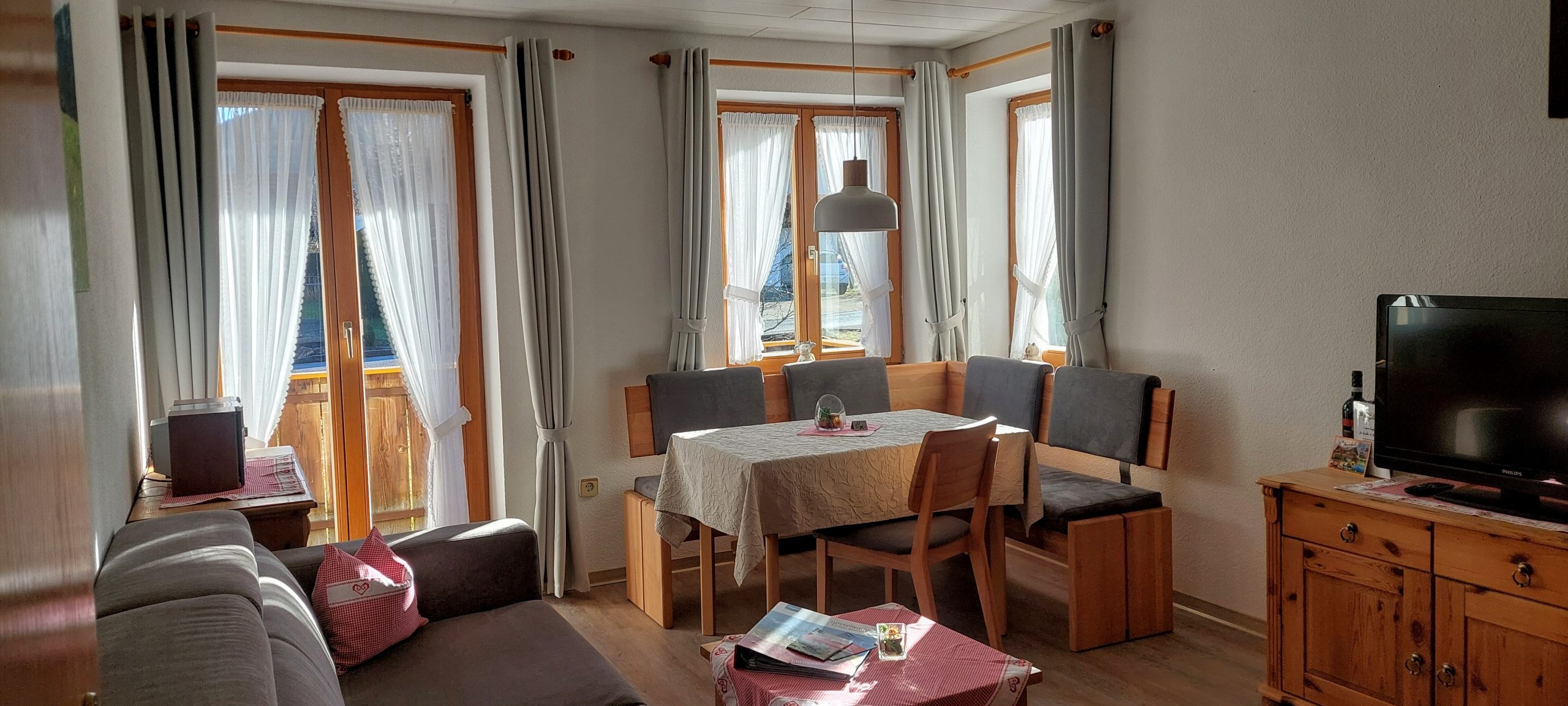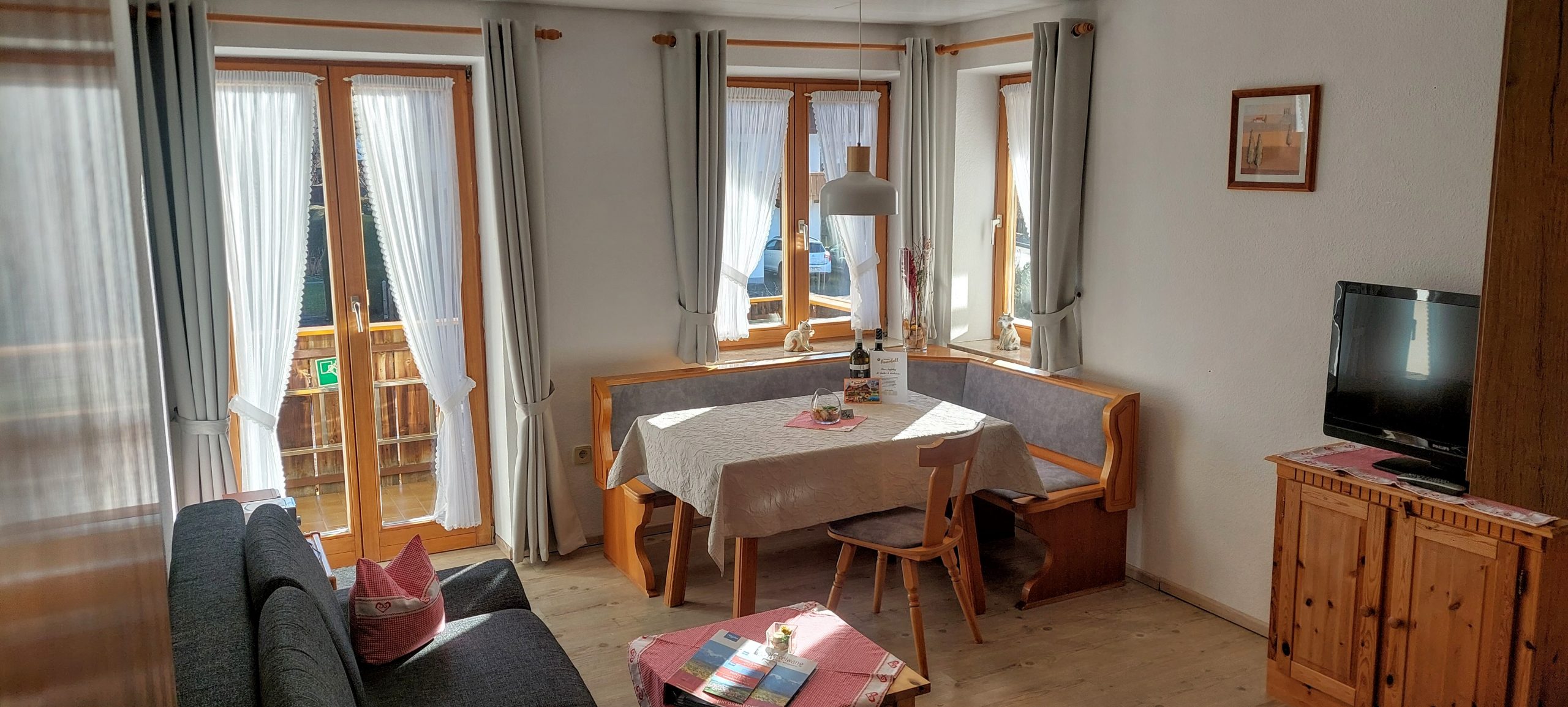 Alle drei Ferienwohnungen verfügen über eine gemütliche Essecke, eine bequeme Couch und eine gut ausgestattete Küchenzeile.